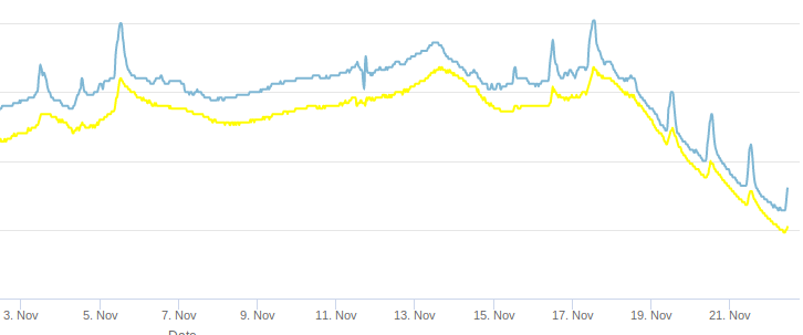 Den 22 november konstaterade vi med viss oro att temperaturen i huset hade fallit stadigt under de senaste 4-5 dagarna, vilket fick mig att misstänka att värmningen slutat fungera. Den lokala minimumtemperaturen på övervåningen (gul linje) varje morgon var under fyra dagar i följd 10,6, 9,4, 8,4 och 7,4 grader Celsius.