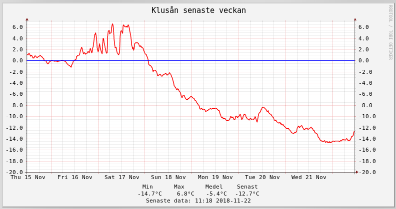 Jag kunde dock lugna mig själv efter att ha hittat nedanstående kurva över senaste veckans utomhustemperatur i Klusån. Det visade sig att temperaturen föregående helg legat runt +6 grader och därefter fallit med jämn takt cirka 20 grader ner till -14. Kurvans utveckling svarade mycket bra mot inomhustemperaturen i Bovallen, så det fanns ingen anledning att befara något missöde med värmningen!
